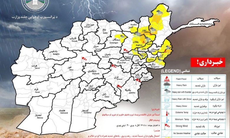 اداره هواشناسی وزارت ترانسپورت و هوانوردی طالبان از احتمال بارش بارانهای نسبتاً شدید و سرازیرشدن سیلابهای آنی در ۱۲ ولایت کشور خبر داد.